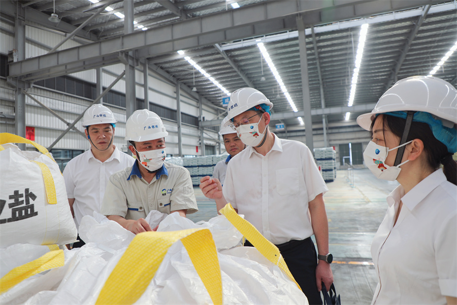 在廣西銀鵬品種鹽有限公司,邱潮涌從嚴(yán)從細(xì)檢查安全管控設(shè)備設(shè)施運行、節(jié)前安全防范措施落實及7S精細(xì)化管理工作等情況,著重排查生產(chǎn)重點部位和關(guān)鍵環(huán)節(jié)的安全風(fēng)險隱患,認(rèn)真聽取銀鵬公司關(guān)于生產(chǎn)經(jīng)營、提質(zhì)增效及難點堵點等情況。